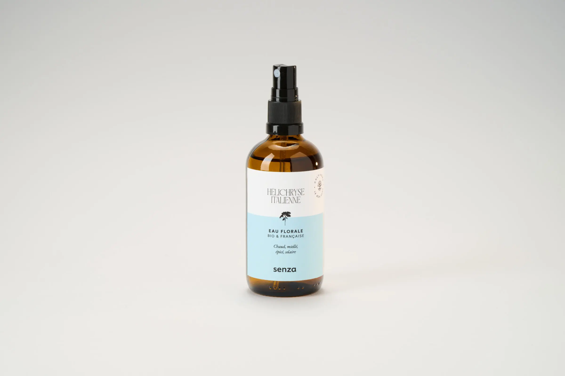 Eau florale d’Hélichryse italienne d’Île-de- France. Plantes cultivées en agriculture biologique et agroforesterie, distillation par entraînement à la vapeur (même valeur de plante/d’eau).