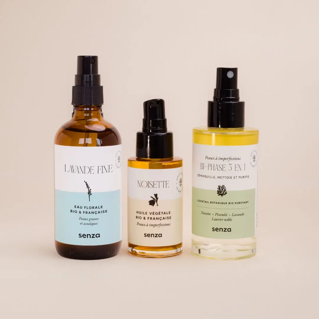 Les peaux à imperfections, souvent sujettes à l’excès de sébum et aux boutons, ont besoin de soins équilibrants et purifiants. SENZA propose une routine de soins naturelle et minimaliste pour retrouver une peau plus nette :